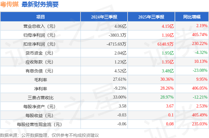据证券之星公开数据整理,近期粤传媒(002181)发布2025年三季报。截至本报告期末,公司营业总收入4.15亿元,同比上升2.19%,归母净利润1.16亿元,同比上升405.74%。按单季度数据看,第三季度营业总收入1.4亿元,同比下降2.2%,第三季度归母净利润1178.11万元,同比上升19.05%。本报告期粤传媒盈利能力上升,毛利率同比增幅9.95%,净利率同比增幅406.05%。