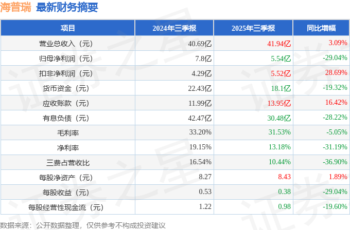 据证券之星公开数据整理,近期海普瑞(002399)发布2025年三季报。根据财报显示,海普瑞增收不增利。截至本报告期末,公司营业总收入41.94亿元,同比上升3.09%,归母净利润5.54亿元,同比下降29.04%。按单季度数据看,第三季度营业总收入13.77亿元,同比上升11.82%,第三季度归母净利润1.32亿元,同比上升13.14%。
