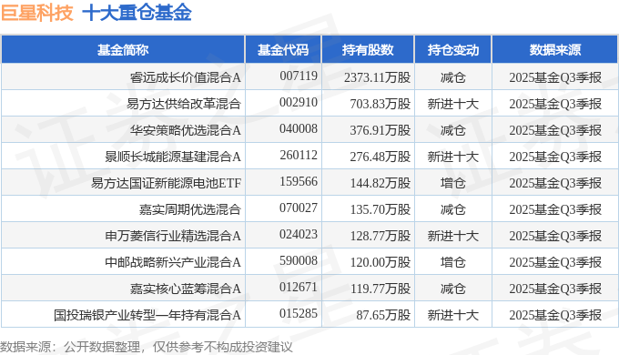 持有巨星科技最多的基金为睿远成长价值混合A,目前规模为213.87亿元,最新净值1.9679(10月30日),较上一交易日下跌2.05%,近一年上涨62.64%。该基金现任基金经理为傅鹏博 朱璘。