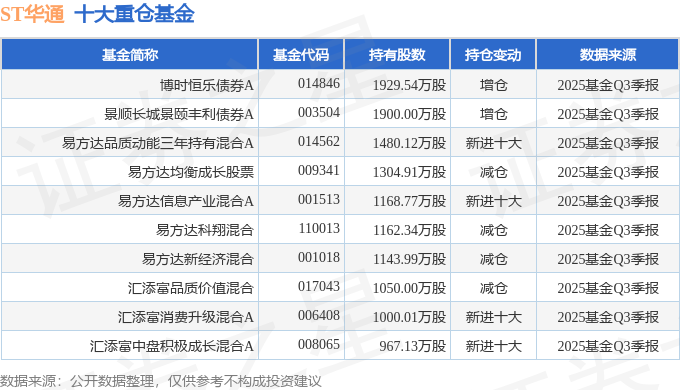 持有ST华通最多的基金为博时恒乐债券A,目前规模为108.07亿元,最新净值1.204(10月31日),较上一交易日上涨0.19%,近一年上涨9.17%。该基金现任基金经理为张李陵。
