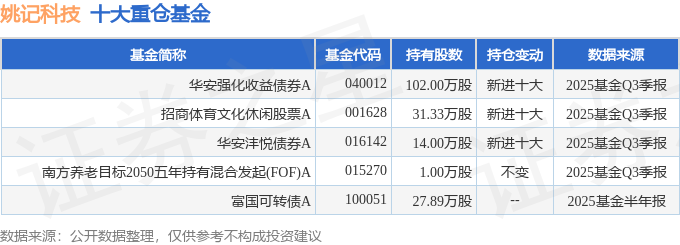 持有姚记科技最多的基金为华安强化收益债券A,目前规模为17.07亿元,最新净值1.4659(10月31日),较上一交易日上涨0.0%,近一年上涨26.13%。该基金现任基金经理为郑伟山。