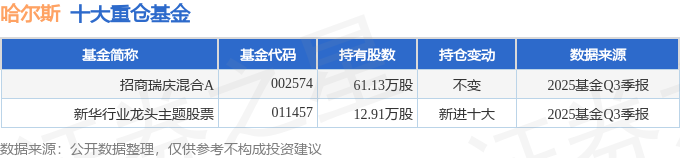 持有哈尔斯最多的基金为招商瑞庆混合A,目前规模为3.83亿元,最新净值1.0782(10月31日),较上一交易日上涨0.28%,近一年上涨7.13%。该基金现任基金经理为余芽芳 王垠。