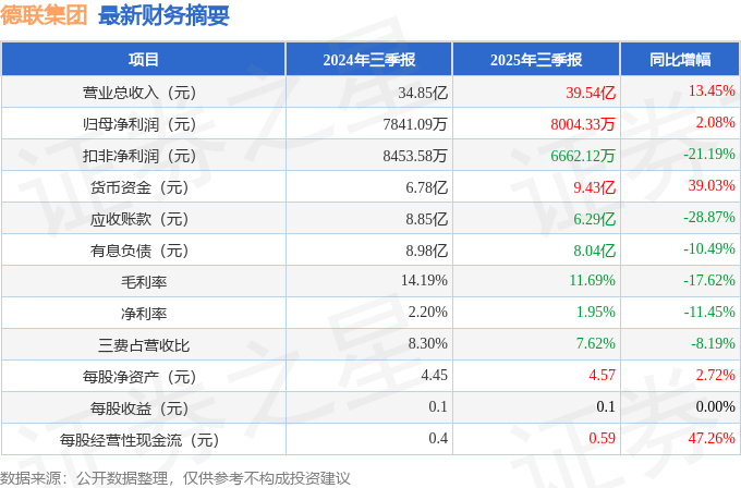 据证券之星公开数据整理,近期德联集团(002666)发布2025年三季报。截至本报告期末,公司营业总收入39.54亿元,同比上升13.45%,归母净利润8004.33万元,同比上升2.08%。按单季度数据看,第三季度营业总收入13.58亿元,同比上升6.86%,第三季度归母净利润2068.48万元,同比下降26.05%。本报告期德联集团公司应收账款体量较大,当期应收账款占最新年报归母净利润比达915.02%。