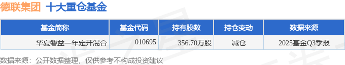 持有德联集团最多的基金为华夏磐益一年定开混合,目前规模为5.4亿元,最新净值1.4467(10月31日),较上一交易日上涨0.9%,近一年上涨33.47%。该基金现任基金经理为张城源。