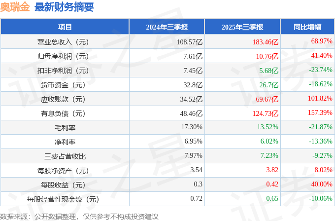 据证券之星公开数据整理,近期奥瑞金(002701)发布2025年三季报。截至本报告期末,公司营业总收入183.46亿元,同比上升68.97%,归母净利润10.76亿元,同比上升41.4%。按单季度数据看,第三季度营业总收入66.19亿元,同比上升81.28%,第三季度归母净利润1.73亿元,同比下降18.61%。本报告期奥瑞金应收账款上升,应收账款同比增幅达101.82%。