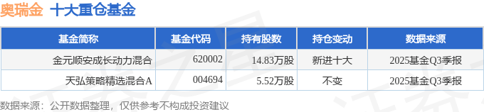 持有奥瑞金最多的基金为金元顺安成长动力混合,目前规模为0.28亿元,最新净值1.0243(10月31日),较上一交易日上涨0.45%,近一年上涨28.8%。该基金现任基金经理为孔祥鹏 韩辰尧。