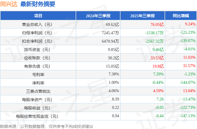 据证券之星公开数据整理,近期同兴达(002845)发布2025年三季报。截至本报告期末,公司营业总收入76.05亿元,同比上升9.24%,归母净利润-1538.17万元,同比下降121.23%。按单季度数据看,第三季度营业总收入28.11亿元,同比上升6.99%,第三季度归母净利润1361.91万元,同比下降75.02%。本报告期同兴达公司应收账款体量较大,当期应收账款占最新年报归母净利润比达10313.7%。