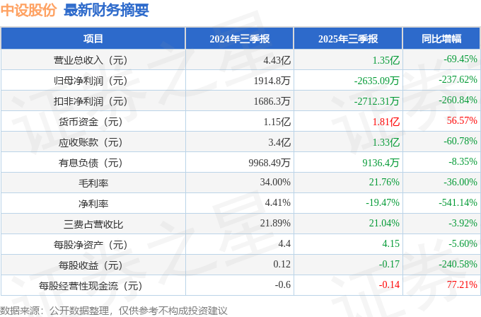 据证券之星公开数据整理,近期中设股份(002883)发布2025年三季报。截至本报告期末,公司营业总收入1.35亿元,同比下降69.45%,归母净利润-2635.09万元,同比下降237.62%。按单季度数据看,第三季度营业总收入4058.77万元,同比下降69.55%,第三季度归母净利润-1913.24万元,同比下降6113.19%。本报告期中设股份公司应收账款体量较大,当期应收账款占最新年报归母净利润比达1312.37%。