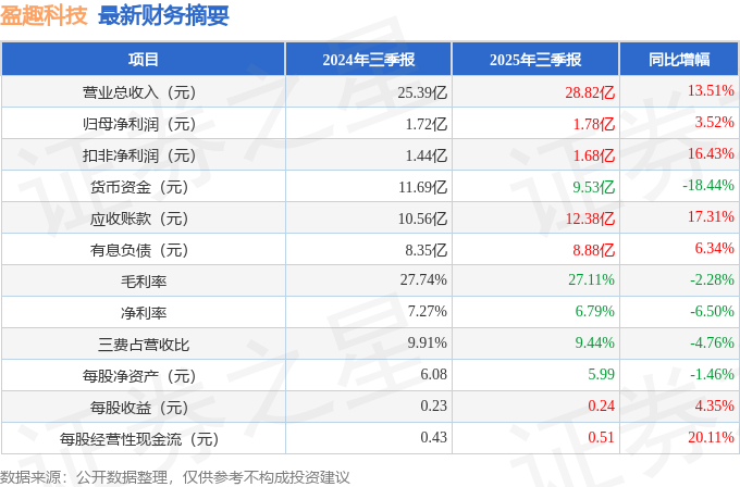 据证券之星公开数据整理,近期盈趣科技(002925)发布2025年三季报。截至本报告期末,公司营业总收入28.82亿元,同比上升13.51%,归母净利润1.78亿元,同比上升3.52%。按单季度数据看,第三季度营业总收入10.62亿元,同比上升10.2%,第三季度归母净利润4011.84万元,同比上升10.46%。本报告期盈趣科技公司应收账款体量较大,当期应收账款占最新年报归母净利润比达492.34%。