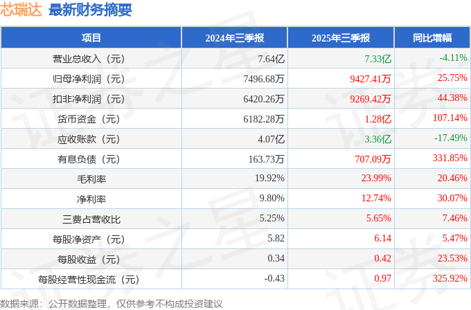 据证券之星公开数据整理,近期芯瑞达(002983)发布2025年三季报。截至本报告期末,公司营业总收入7.33亿元,同比下降4.11%,归母净利润9427.41万元,同比上升25.75%。按单季度数据看,第三季度营业总收入2.42亿元,同比下降14.38%,第三季度归母净利润2774.83万元,同比上升29.45%。本报告期芯瑞达盈利能力上升,毛利率同比增幅20.46%,净利率同比增幅30.07%。