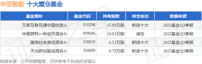 持有华亚智能最多的基金为万家互联互通中国优势A,目前规模为2.94亿元,最新净值0.9208(10月30日),较上一交易日下跌1.47%,近一年上涨35.39%。该基金现任基金经理为尹航。