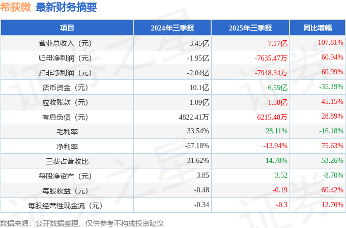 据证券之星公开数据整理,近期希荻微(688173)发布2025年三季报。根据财报显示,希荻微营收上升亏损收窄。截至本报告期末,公司营业总收入7.17亿元,同比上升107.81%,归母净利润-7635.47万元,同比上升60.94%。按单季度数据看,第三季度营业总收入2.51亿元,同比上升117.99%,第三季度归母净利润-3166.63万元,同比上升59.36%。