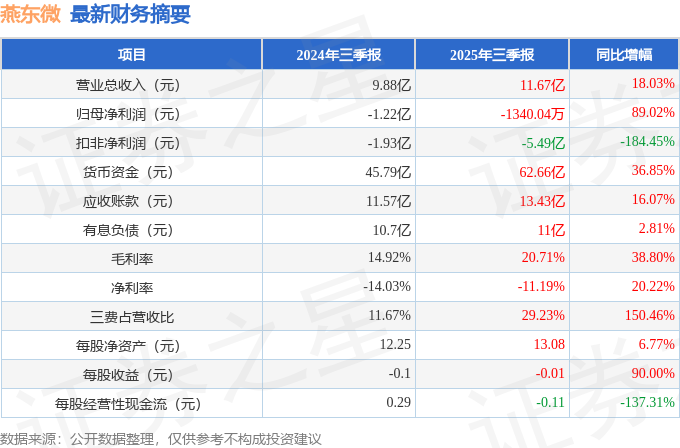 据证券之星公开数据整理,近期燕东微(688172)发布2025年三季报。截至本报告期末,公司营业总收入11.67亿元,同比上升18.03%,归母净利润-1340.04万元,同比上升89.02%。按单季度数据看,第三季度营业总收入5.08亿元,同比上升36.59%,第三季度归母净利润-1.41亿元,同比下降31.87%。本报告期燕东微三费占比上升明显,财务费用、销售费用和管理费用总和占总营收同比增幅达150.46%。