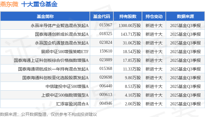 持有燕东微最多的基金为永赢半导体产业智选混合发起A,目前规模为8.58亿元,最新净值1.6569(10月31日),较上一交易日下跌2.81%,近一年上涨62.11%。该基金现任基金经理为张海啸。