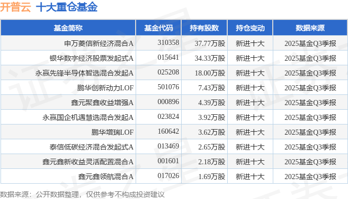 持有开普云最多的基金为申万菱信新经济混合A,目前规模为12.41亿元,最新净值1.2273(10月31日),较上一交易日下跌2.49%,近一年上涨32.96%。该基金现任基金经理为付娟。