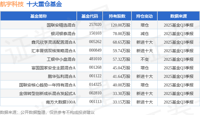 持有航宇科技最多的基金为国联安精选混合,目前规模为12.97亿元,最新净值0.983(10月31日),较上一交易日下跌1.11%,近一年上涨44.13%。该基金现任基金经理为魏东。