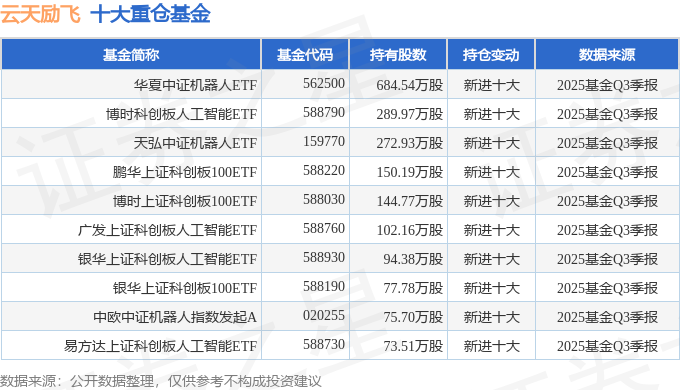 持有云天励飞最多的基金为华夏中证机器人ETF,目前规模为227.98亿元,最新净值1.0287(10月31日),较上一交易日上涨0.03%,近一年上涨42.62%。该基金现任基金经理为华龙。