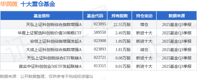 持有华润微最多的基金为天弘上证科创板综合指数增强A,目前规模为11.12亿元,最新净值1.4166(10月31日),较上一交易日下跌1.03%。该基金现任基金经理为林心龙。