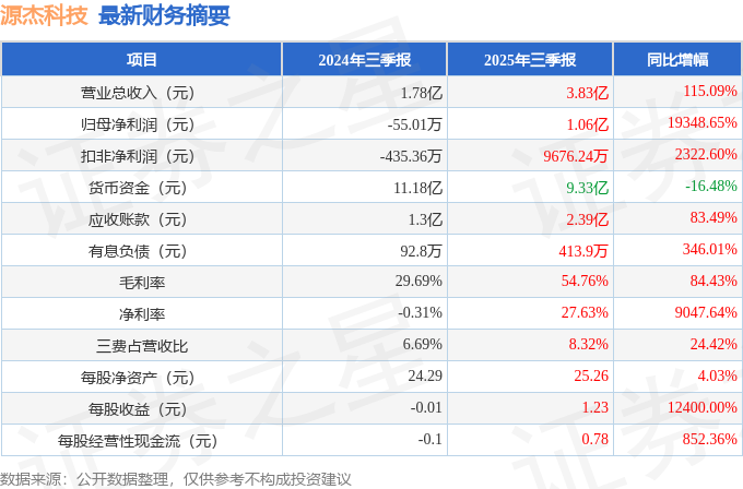 据证券之星公开数据整理,近期源杰科技(688498)发布2025年三季报。截至本报告期末,公司营业总收入3.83亿元,同比上升115.09%,归母净利润1.06亿元,同比上升19348.65%。按单季度数据看,第三季度营业总收入1.78亿元,同比上升207.31%,第三季度归母净利润5962.89万元,同比上升627.62%。本报告期源杰科技盈利能力上升,毛利率同比增幅84.43%,净利率同比增幅9047.64%。