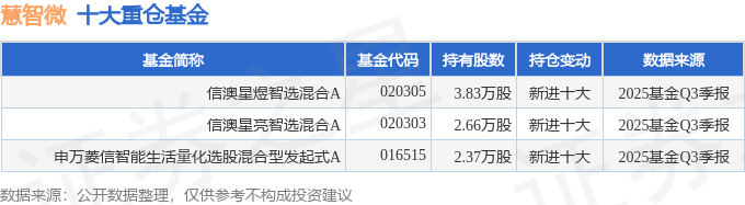 持有慧智微最多的基金为信澳星煜智选混合A,目前规模为0.23亿元,最新净值1.7494(10月31日),较上一交易日上涨0.77%,近一年上涨50.62%。该基金现任基金经理为冯玺祥。