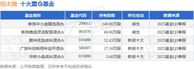 持有裕太微最多的基金为泰信中小盘精选混合,目前规模为17.22亿元,最新净值4.468(10月31日),较上一交易日上涨0.74%,近一年上涨62.69%。该基金现任基金经理为董季周。