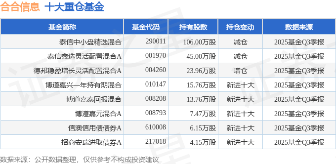 持有合合信息最多的基金为泰信中小盘精选混合,目前规模为17.22亿元,最新净值4.468(10月31日),较上一交易日上涨0.74%,近一年上涨62.69%。该基金现任基金经理为董季周。