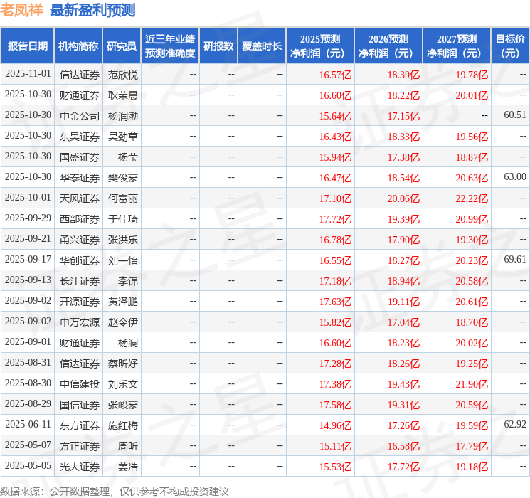 公司是国内历史悠久的黄金珠宝企业,具备强品牌声望与产品设计能力,2025年持续推进主题门店升级改造并密集推新,通过非遗技艺、国风元素与IP联动持续拓展年轻客群。根据2025年三季报,我们预计2025-2027年EPS分别为3.11/3.49/3.87元,当前股价对应PE分别为16/14/13倍,首次覆盖,给予“买入”投资评级。