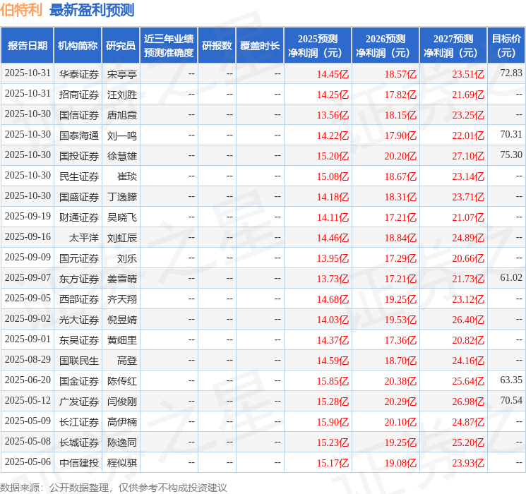 最新盈利预测明细如下: