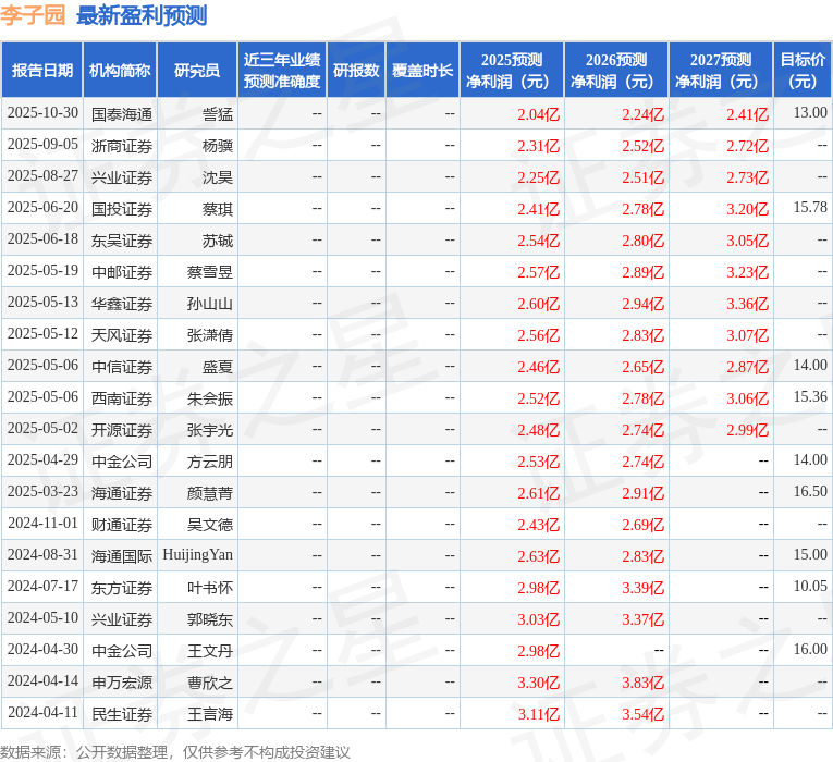 最新盈利预测明细如下:
