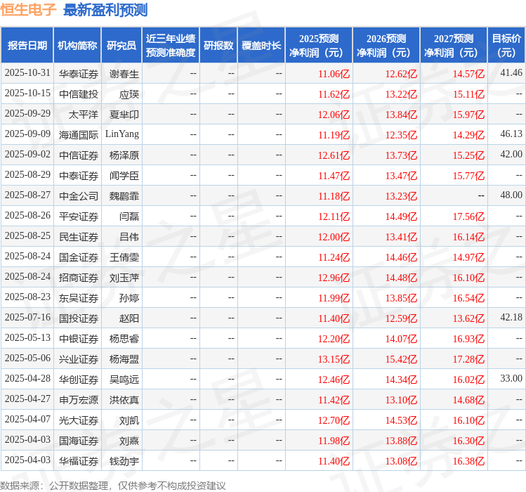 最新盈利预测明细如下: