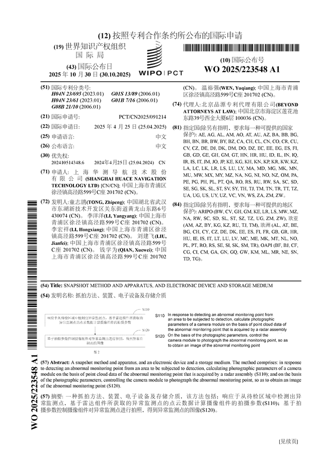 证券之星消息,根据企查查数据显示华测导航(300627)公布了一项国际专利申请,专利名为“抓拍方法、装置、电子设备及存储介质”,专利申请号为PCT/CN2025/091214,国际公布日为2025年10月30日。