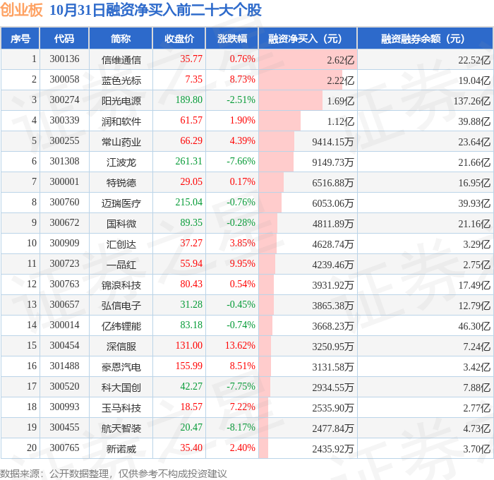 创业板融资净买入前三分别为:信维通信(300136)融资净买入2.62亿元、蓝色光标(300058)融资净买入2.22亿元、阳光电源(300274)融资净买入1.69亿元,前20具体见下表:
