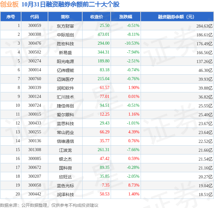 创业板融资融券余额前三分别为:东方财富(300059)融资融券余额284.63亿元、中际旭创(300308)融资融券余额186.61亿元、胜宏科技(300476)融资融券余额176.49亿元,前20具体见下表: