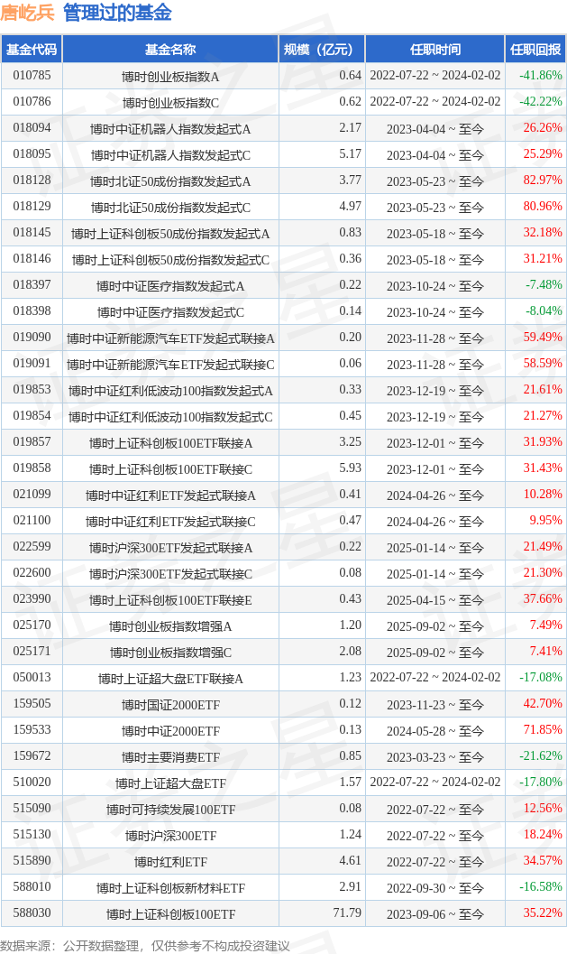唐屹兵先生:中国国籍,硕士。2015年从美国罗格斯大学硕士研究生毕业后加入博时基金管理有限公司。历任研究员、高级研究员、投资经理助理、基金经理助理、上证超级大盘交易型开放式指数证券投资基金(2022年7月22日-2024年2月2日)、博时创业板指数证券投资基金(2022年7月22日-2024年2月2日)、博时上证超级大盘交易型开放式指数证券投资基金联接基金(2022年7月22日-2024年2月2日)的基金经理。现任博时沪深300交易型开放式指数证券投资基金(2022年7月22日-至今)、博时中证红利交易型开放式指数证券投资基金(2022年7月22日-至今)、博时中证可持续发展100交易型开放式指数证券投资基金(2022年7月22日-至今)、博时上证科创板新材料交易型开放式指数证券投资基金(2022年9月30日-至今)、博时中证主要消费交易型开放式指数证券投资基金(2023年3月23日-至今)、博时中证机器人指数型发起式证券投资基金(2023年4月4日-至今)、博时上证科创板50成份指数型发起式证券投资基金(2023年5月18日-至今)、博时北证50成份指数型发起式证券投资基金(2023年5月23日-至今)、博时上证科创板100交易型开放式指数证券投资基金(2023年9月6日-至今)、博时中证医疗指数型发起式证券投资基金(2023年10月24日-至今)、博时国证2000交易型开放式指数证券投资基金(2023年11月23日-至今)、博时中证新能源汽车交易型开放式指数证券投资基金发起式联接基金(2023年11月28日-至今)、博时上证科创板100交易型开放式指数证券投资基金联接基金(2023年12月1日-至今)、博时中证红利低波动100指数型发起式证券投资基金(2023年12月19日-至今)、博时中证红利交易型开放式指数证券投资基金发起式联接基金(2024年4月26日-至今)、博时中证2000交易型开放式指数证券投资基金(2024年5月28日-至今)、博时沪深300交易型开放式指数证券投资基金发起式联接基金(2025年1月14日—至今)的基金经理。