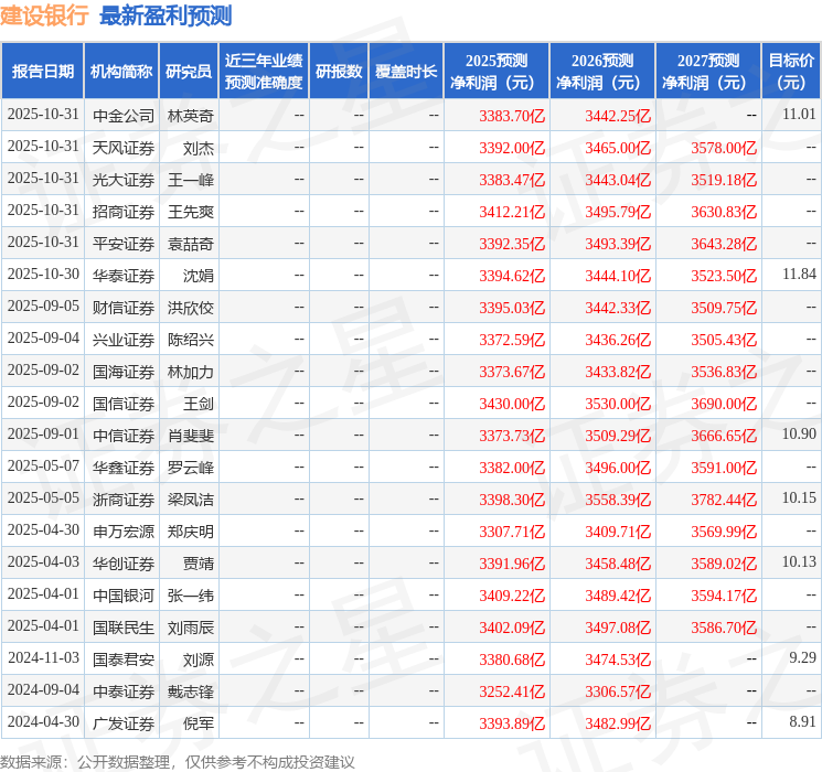 中国银河证券股份有限公司张一纬,袁世麟近期对建设银行进行研究并发布了研究报告《建设银行2025年三季报业绩点评:净利润增速转正,中收边际回暖》,给予建设银行买入评级。