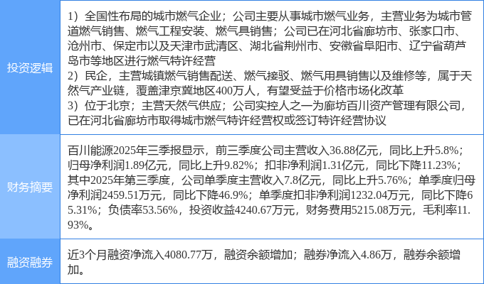 证券之星消息,百川能源11月3日涨停收盘,收盘价4.64元。该股于9点31分涨停,1次打开涨停,截止收盘封单资金为4657.45万元,占其流通市值0.75%。