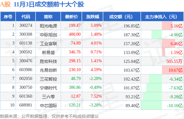 当日A股成交额前10大个股中7只个股收涨,平均涨幅3.54%,其中阳光电源(300274)以成交额196.85亿元排第一。从主力资金流入看,成交额前10大个股中有5只个股呈现主力资金净流入。