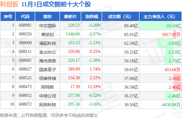 当日科创板成交额前10大个股中4只个股收涨,平均涨幅4.17%,其中中芯国际(688981)以成交额89.4亿元排第一。从主力资金流入看,成交额前10大个股中有4只个股呈现主力资金净流入。