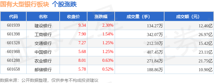 证券之星消息,11月3日国有大型银行板块较上一交易日上涨1.07%,建设银行领涨。当日上证指数报收于3976.52,上涨0.55%。深证成指报收于13404.06,上涨0.19%。国有大型银行板块个股涨跌见下表: