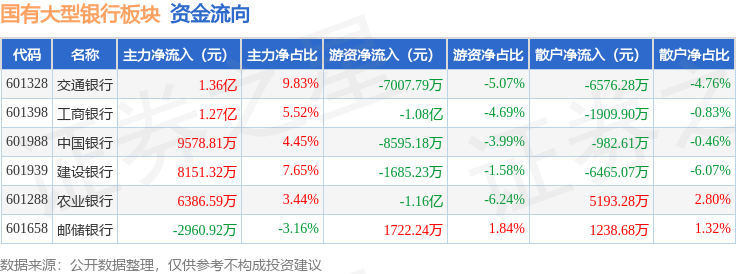 从资金流向上来看,当日国有大型银行板块主力资金净流入4.75亿元,游资资金净流出3.8亿元,散户资金净流出9501.91万元。国有大型银行板块个股资金流向见下表: