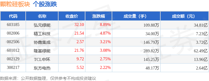 证券之星消息,11月3日颗粒硅板块较上一交易日上涨3.56%,弘元绿能领涨。当日上证指数报收于3976.52,上涨0.55%。深证成指报收于13404.06,上涨0.19%。颗粒硅板块个股涨跌见下表: