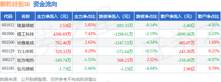 从资金流向上来看,当日颗粒硅板块主力资金净流入1.31亿元,游资资金净流出1.56亿元,散户资金净流入2471.95万元。颗粒硅板块个股资金流向见下表: