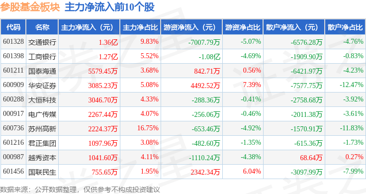 从资金流向上来看,当日参股基金板块主力资金净流出22.06亿元,游资资金净流入13.6亿元,散户资金净流入8.46亿元。参股基金板块个股资金流向见下表: