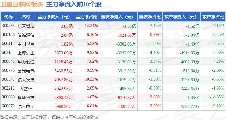 从资金流向上来看,当日卫星互联网板块主力资金净流入7327.61万元,游资资金净流入1.09亿元,散户资金净流出1.82亿元。卫星互联网板块个股资金流向见下表: