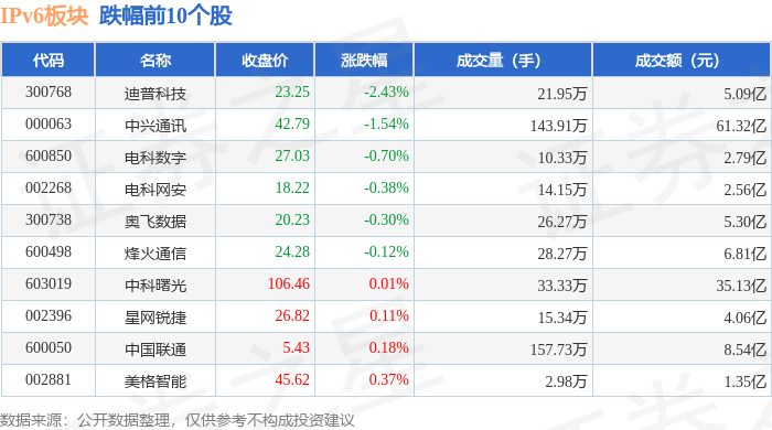 从资金流向上来看,当日IPv6板块主力资金净流出9.7亿元,游资资金净流入2.64亿元,散户资金净流入7.05亿元。IPv6板块个股资金流向见下表: