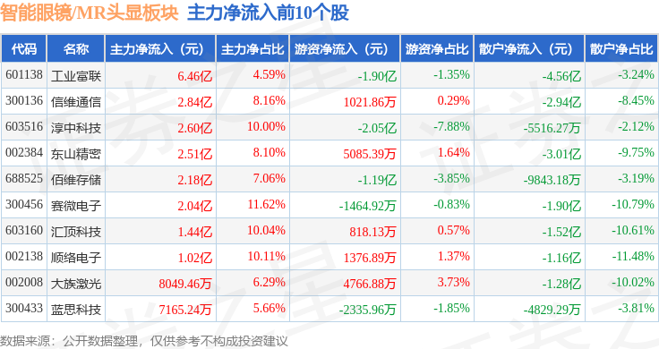 从资金流向上来看,当日智能眼镜/MR头显板块主力资金净流入2.47亿元,游资资金净流入2.26亿元,散户资金净流出4.72亿元。智能眼镜/MR头显板块个股资金流向见下表: