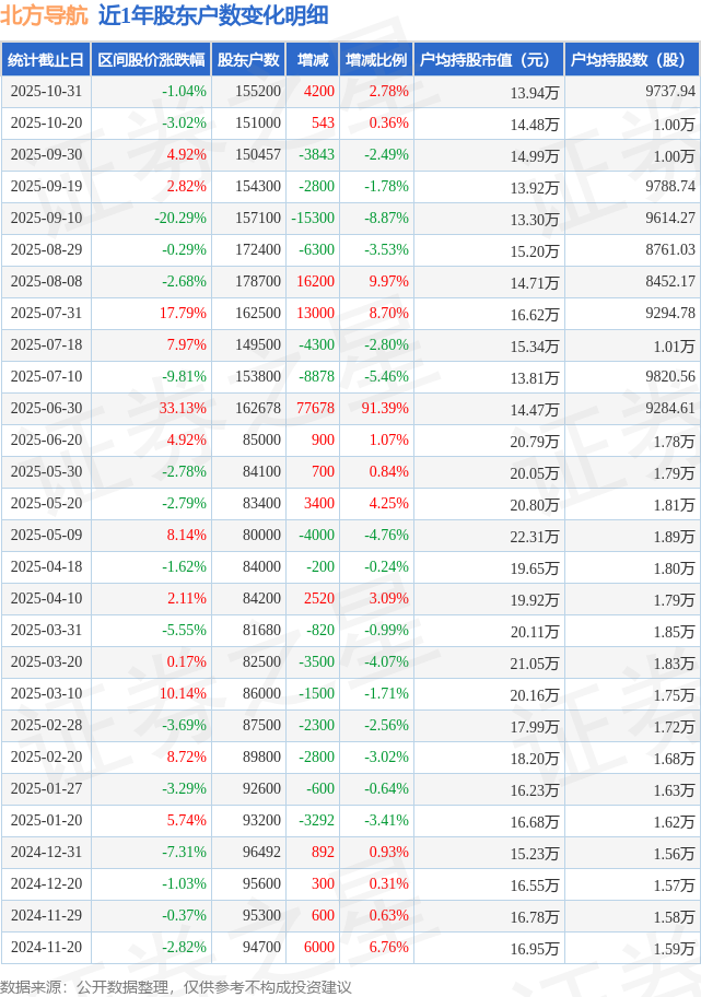从股价来看,2025年10月20日至2025年10月31日,北方导航区间跌幅为1.04%,在此期间股东户数增加4200.0户,增幅为2.78%。
