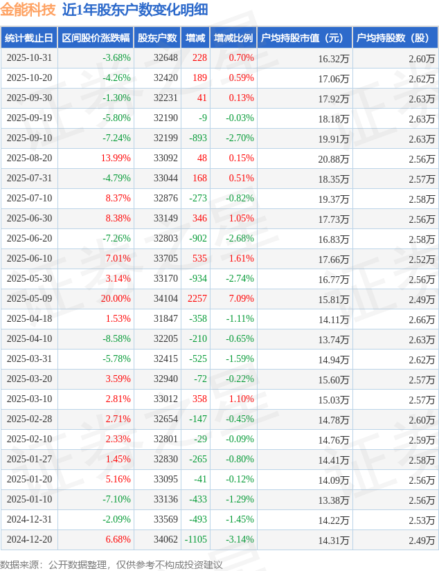 从股价来看,2025年10月20日至2025年10月31日,金能科技区间跌幅为3.68%,在此期间股东户数增加228.0户,增幅为0.7%。