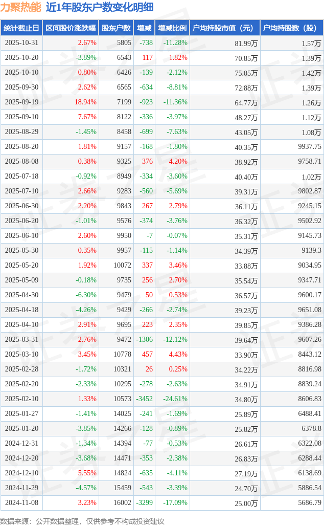 从股价来看,2025年10月20日至2025年10月31日,力聚热能区间涨幅为2.67%,在此期间股东户数减少738.0户,减幅为11.28%。