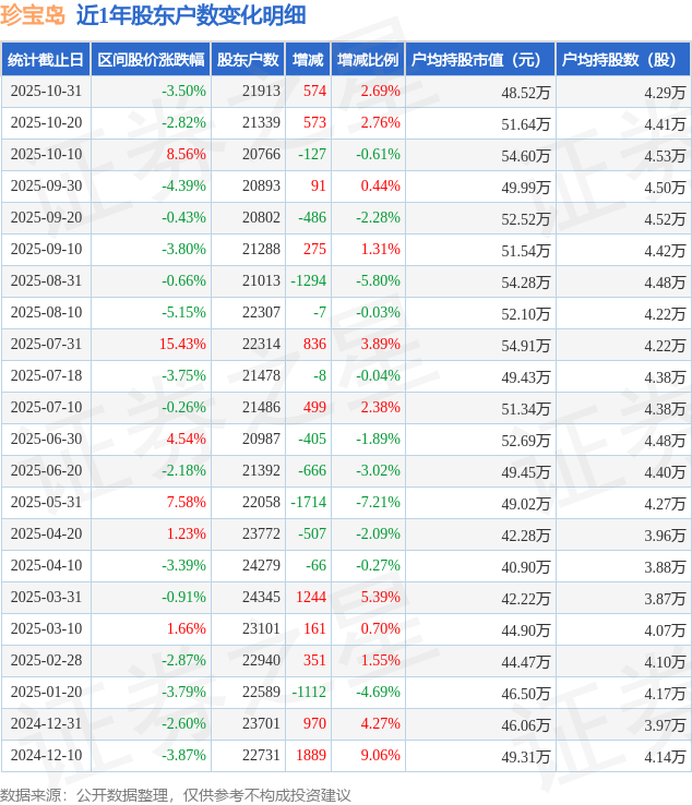 从股价来看,2025年10月20日至2025年10月31日,珍宝岛区间跌幅为3.5%,在此期间股东户数增加574.0户,增幅为2.69%。